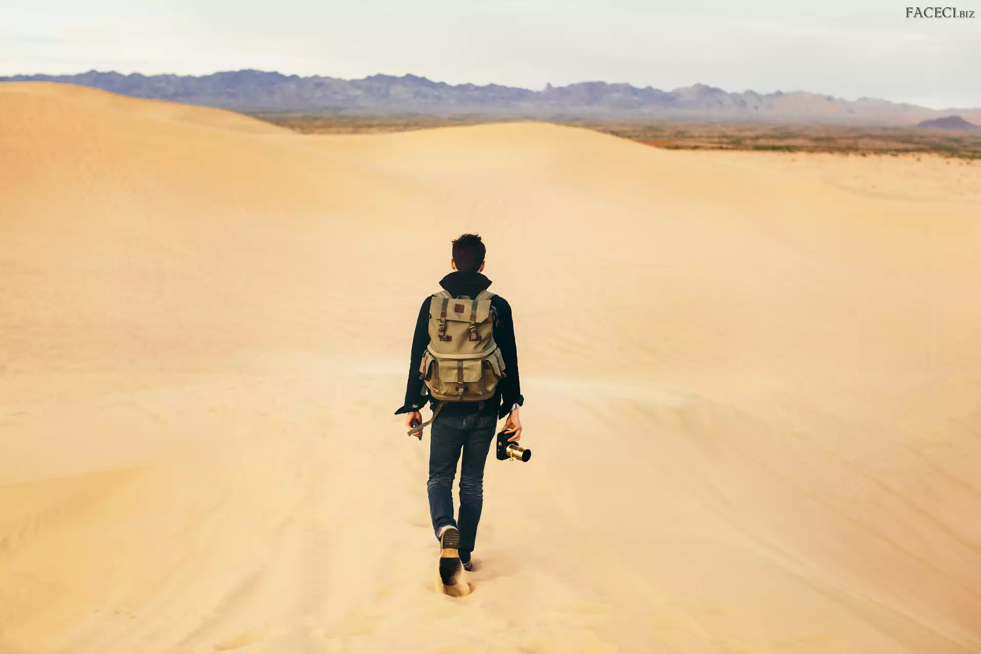Mężczyzna, Aparat fotograficzny, Pustynia, Plecak - faceci.biz